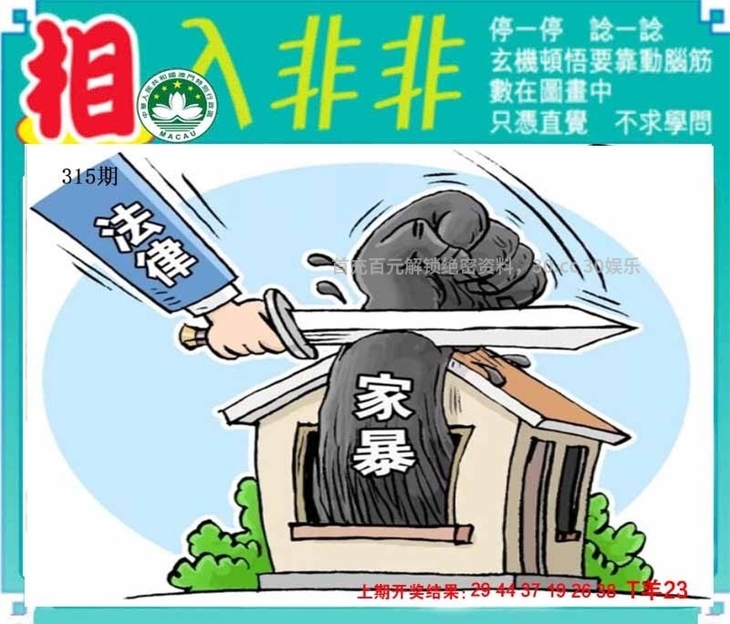 | 315期: 解:家暴解丑肖牛虎鼠猴猪狗 综合:牛虎鼠猴猪狗 特码:17.41.04.28.30.42.10.46.19.43.32.44 |